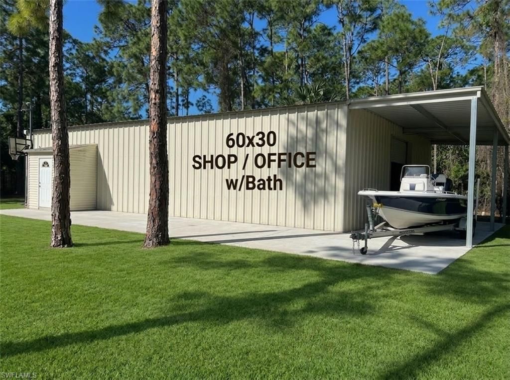 Welcome to Pinson Drive a beautiful 1.25 acre property. A stunning remodeled 3-bedroom, 2-bath home that is truly move-in ready. Clean new and modern accents with an expansive lanai. The entire home has been thoughtfully updated with new flooring, new appliances, all solid surface countertops and a redesigned layout that includes an added bedroom and bathroom, creating a spacious and functional living space. Situated on all upland property with no flood insurance required and no HOA restrictions...Welcome to Pinson Drive a beautiful 1.25 acre property. A stunning remodeled 3-bedroom, 2-bath home that is truly move-in ready. Clean new and modern accents with an expansive lanai. The entire home has been thoughtfully updated with new flooring, new appliances, all solid surface countertops and a redesigned layout that includes an added bedroom and bathroom, creating a spacious and functional living space. Situated on all upland property with no flood insurance required and no HOA restrictions, this property offers both peace of mind and flexibility. A standout feature is the impressive 60x30 metal building complete with its own office and bathroom—perfect for a small business, workshop, storage for toys, or hobby space. Located just 2 miles from shopping, dining, and everything the revitalized Old Bonita Springs area has to offer, this property combines modern updates, convenience, and versatility. Ready for your immediate enjoyment.